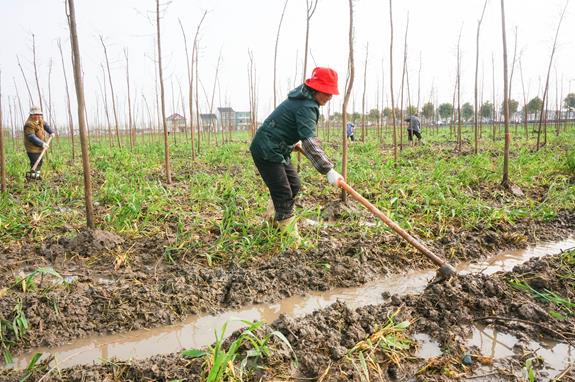 图为四村村的妇女正在为公益林里新植树苗开挖排水沟时俊和/摄 2015年4月8日