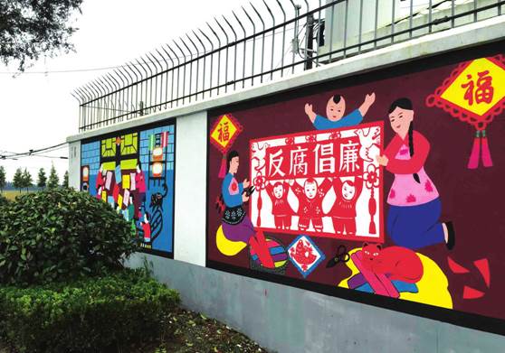 【同建村构造廉政与村民文化墙】 11月,同建村用廉政文化墙为干部拒腐防变构筑了第一道有形的思想防线。走进同建村公共文化中心区域,首先映入眼帘的便是醒目位置上一组廉政文化墙。上书催人奋进的廉政警句,和充满着浓浓关怀的警示格言,吹送着阵阵廉洁清风。长100米、高2.5米、面积为250平方米的文化墙。墙面重新刷白,图画全部采用手绘绘画,共有34幅,涵盖了核心价值篇、终身学习篇、家风家训篇、廉政建设、新农村新生活等内容。